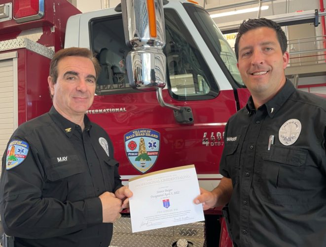 BALD HEAD ISLAND — Public Safety Lt. Steven P. Barger recently received an international recognition, making him one of only 636 individuals in the world to earn the designation. Barger successfully completed the voluntary process to become a Fire Officer, credentialed by the Center for Public Safety Excellence’s Commission on Professional Credentialing (CPC) Apr. 5.