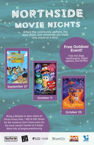 Northside Movie Nights kick off at Portia Hines Park on Sept. 27, 5:30 p.m., as hosted by Northside Food Co-op, Cucalorus Film Foundation, Wilson Center, the City of Wilmington and DREAMS Center for Arts Education. There will be a vendor market and free food provided by the co-op, which is planning a grocery store on the Northside.