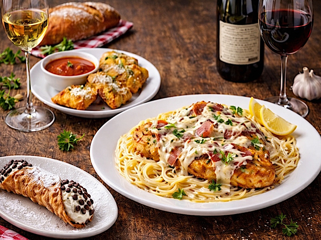 Chicken Francesco — Lightly battered chicken with creamy Alfredo and prosciutto over fettuccine
