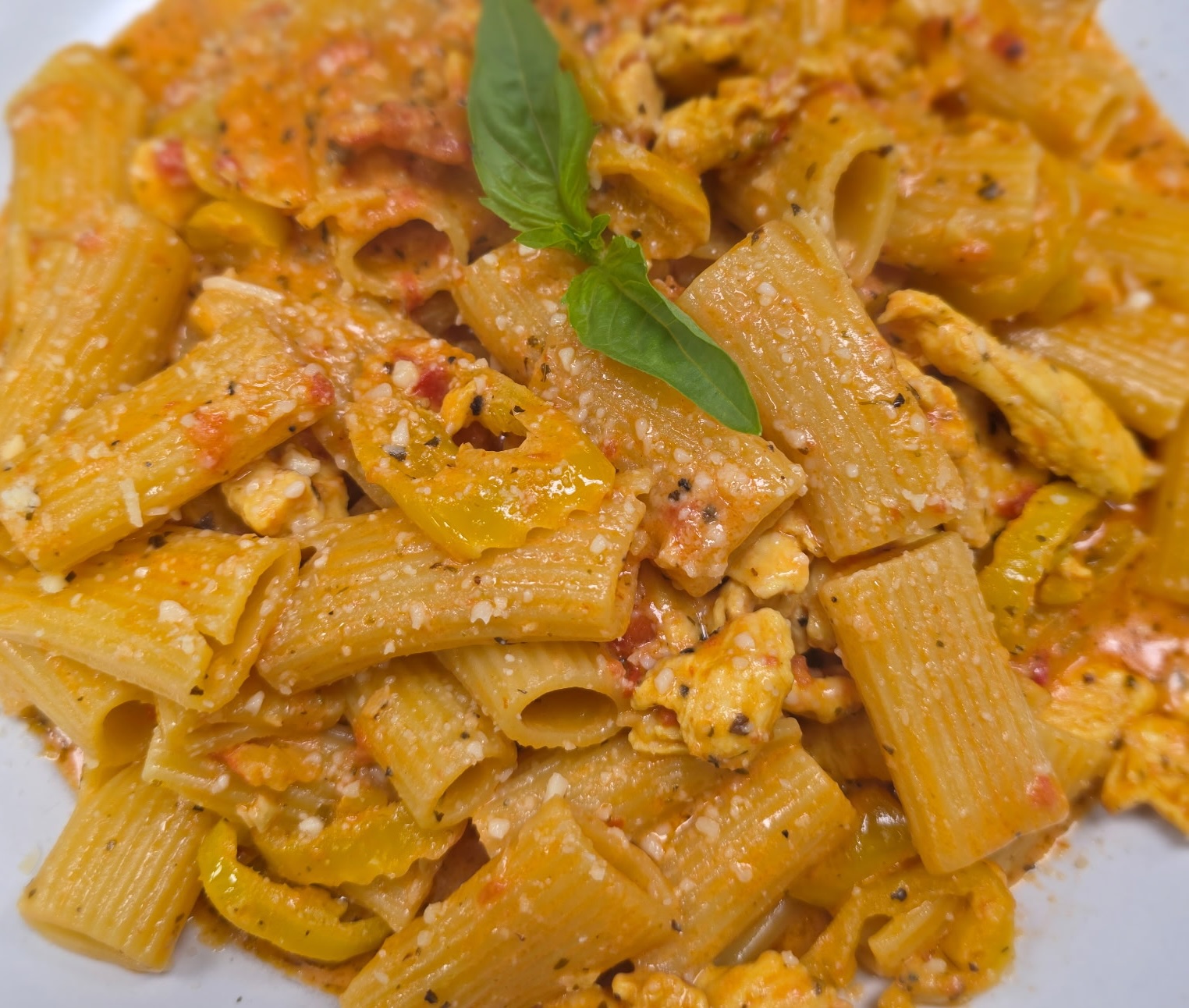 Chicken Riggies — Sauteed chicken breast, banana peppers in a spicy pink sauce tossed in rigatoni pasta