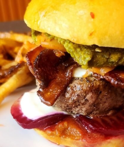 Ground Lamb patty with house made duck bacon, pumpkin curry sauce, pistachio-chimichurri, smoked goat cheese, pickled beets, and house made Kimchi on a fresh baked brioche bun