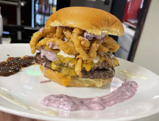 Double cheeseburger with homemade blueberry cream cheese spread, bacon onion jam, topped with cheddar cheese, jalapeños, fried onion straws and drizzled with a homemade ranch cream sauce.