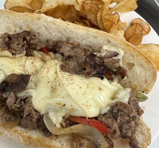 Philly Cheesesteak — Choose from steak, chicken or veggie, topped with mushrooms, onions, peppers and American cheese on a hoagie, served with fresh cut fries