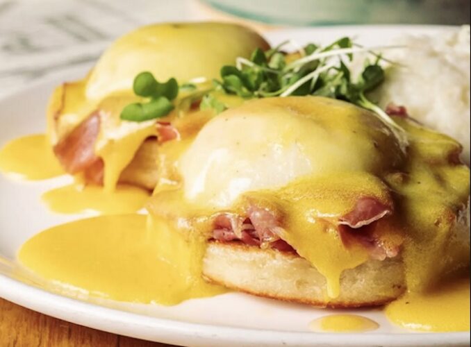 Smoked Ham Benedict: Slow cooked eggs, ham, Hollandaise, Rx sourdough English muffins, grits