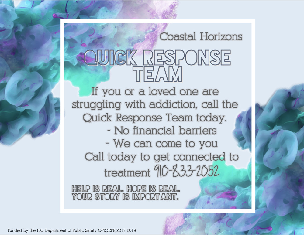 This QRT, operated by Coastal Horizons and in partnership with the City of Wilmington, began in July 2018 to reduce repeat overdoses and to engage survivors into treatment. The purpose of the Quick Response Team (QRT) is to remove any barriers that would prevent an overdose survivor from obtaining the treatment they so desperately need. QRT was created in New Hanover County as a response to our community’s Opioid Epidemic, which QRT now refers to as the “Overdose Epidemic” since many other street-sold substances are laced with the deadly and lethal opioid drug Fentanyl. The increase in Fentanyl use has been one of the leading causes as to why this epidemic still plagues New Hanover County as well as the state of North Carolina and across the country.