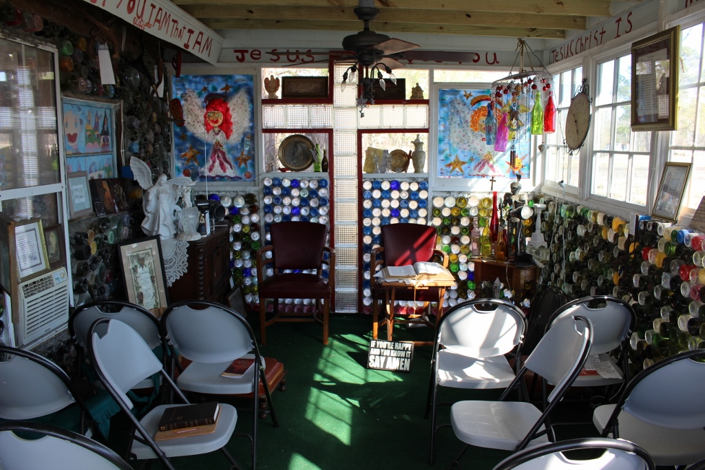 “The Lord told me to build a chapel, and I did. It’s just for people to come to, they can pray, or just sit and think, listen to the music. And you can see how I was able to use all these things I had, laying around, you can relate anything to the gospel. But I was worried, since it’s here at the back of the property, how would people know it was here? But the next day, the phone rang. It was another reporter, saying they were on his way,” she said. “He might say I’m crazy, but he’s part of the plan, just like me.”