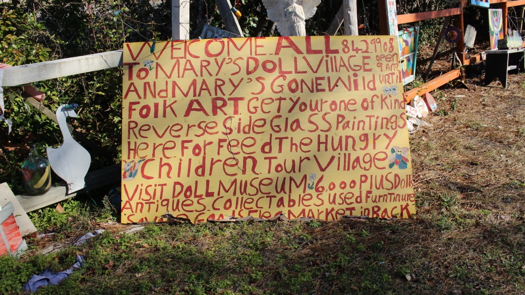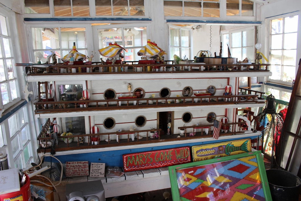 Mary’s Gone Wild is a folk art museum, located on a back road a few miles north of Holden Beach. Owner, artist and Brunswick County native Mary Paulsen has welcomed people from around the world to see her artwork. Paulsen produces two different and distinctive types of work: painted antique glass windows and what she calls “bottle houses,” structures built almost entirely from glass bottles.