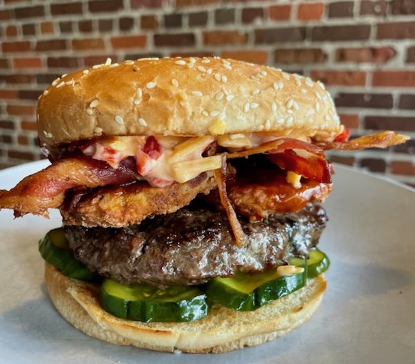 8-ounce Angus burger patty on sesame seed bun with Cheerwine BBQ sauce, house bread and butter pickles, fried green tomato, pimento cheese, bacon and your choice of side