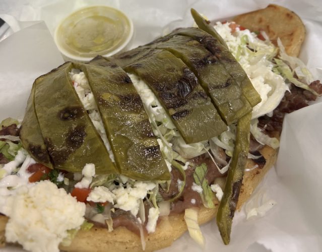 Thick oval-shaped corn tortilla, served with refried beans, lettuce, tomato, sour cream, melted cheese, crumbling cheese , pico, sautéed onions and cactus. Served with your choice of protein